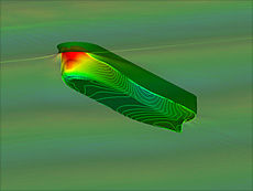 SpinFlowは、ヨットのスピネーカーとメインセイルの周りの流れをシミュレーションすることができます。帆は圧力に応じて変形しなければなりません。帆の動的変形はSpinFlowの機能としてFEMで実現できます。変形が収束するまでCFDとFEMの反復作業を自動的に行うことができます。 メッシュを自動生成する工程にはGUIを用意しています。また、ポストプロセス機能では結果を可視化することができます。